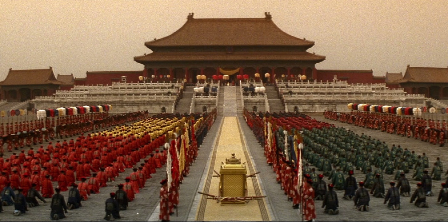 Todo lo que tenía que ver con el impacto visual, con la recreación de los esplendores imperiales primero, los crepúsculos decadentistas más tarde y una etapa final que conecta la dura época del encierro carcelario y luego la posibilidad de poder caminar por las calles, se enmarcó en lujos de escenografía y vestuario que delataron un plan de producción de costos millonarios. Es así que Bertolucci supo vencer la resistencia del gobierno chino para que se le permitiera filmar en la Ciudad Prohibida y en los lugares auténticos citados por el relato biográfico. Pero además era apreciable el uso del color (los dorados del inicio, los claroscuros intermedios, el gris de los años de prisión, la luz que baña el final) como subrayados del planteo, certificando una vez más las notables dotes de iluminador de Vittorio Storaro. Y a todo ello debe sumarse la efectividad de varias soluciones plásticas, como aquella en que el emperador niño accede a un primer contacto con sus cortesanos, envuelto en los pliegues de una larga tela amarilla, o la danza de los Guardias Rojos en torno al flamear de una gran bandera, que recuerda una escena similar en Novecento.